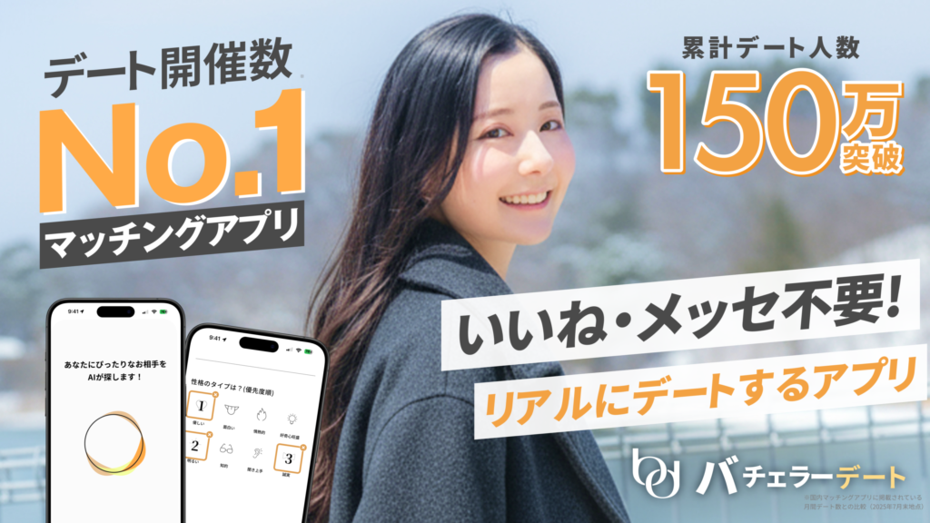 審査制による会員の質の高さと、AIによる最適化。この2つが組み合わさることで、効率的かつ真剣度の高い出会いを実現しているのがバチェラーデートの魅力といえるでしょう。