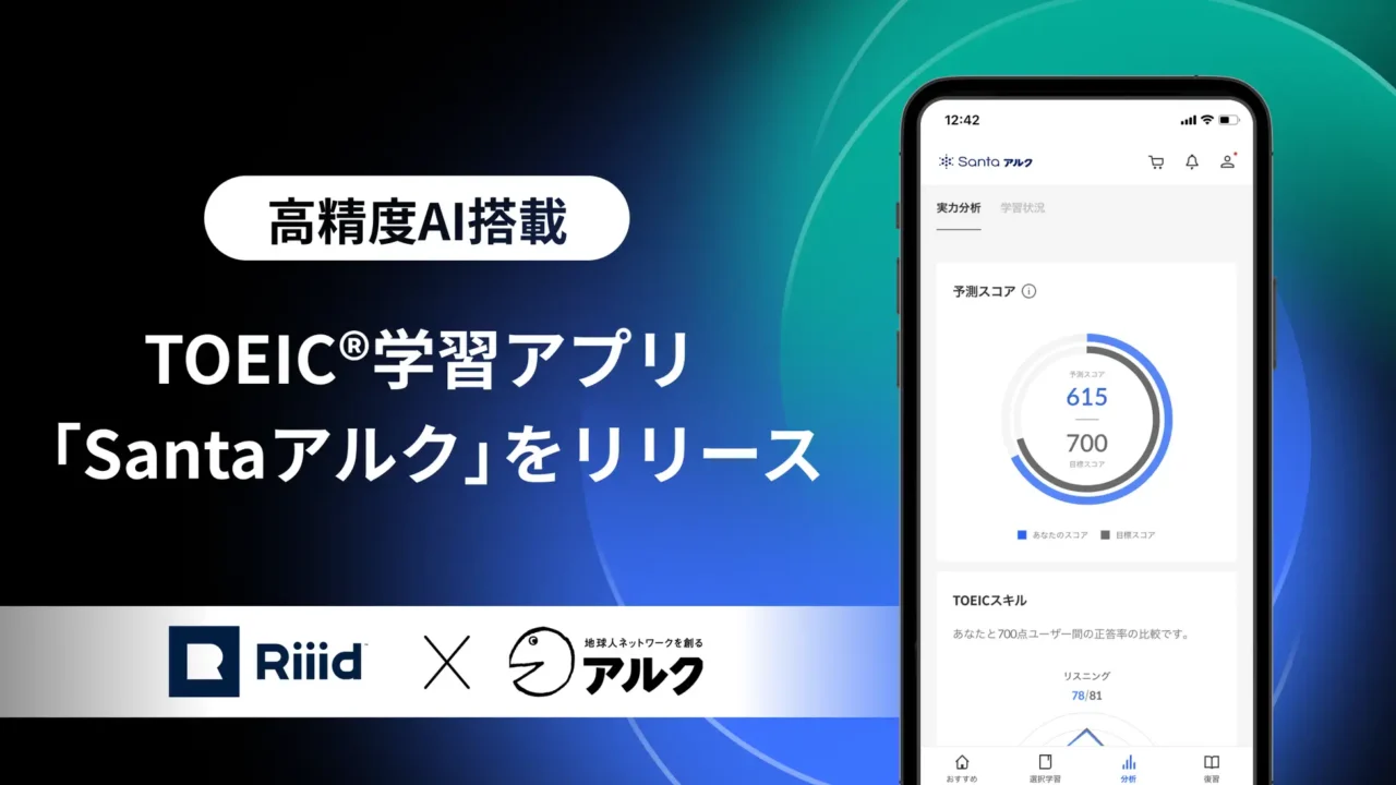 スマホアプリ『Santaアルク』は、アジア圏を中心に累計600万人以上が利用するAI搭載のTOEIC対策アプリです。日本では、英語教育分野で長年の実績を持つ株式会社アルクが運営に関わっており、その信頼性の高さから注目を集めています。